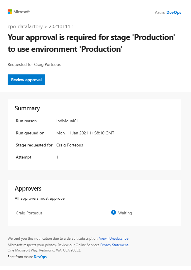 And thats us. When we next trigger a deployment we will see the approval step and our approver will receive the email request to approve our production deployment.