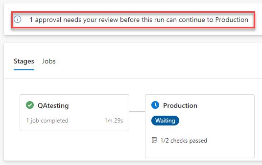 Now that we’ve got our YAML file updated with the production deployment step and to use environments, we can implement the approval step.