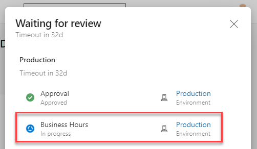 With that gate/check in place we will now see the following when we try to deploy outside of these business hours.