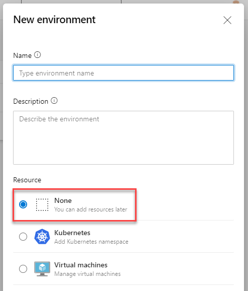 Type in the name of your environment, a little description and select None under Resources as we wont use Kubernetes or VMs here.
