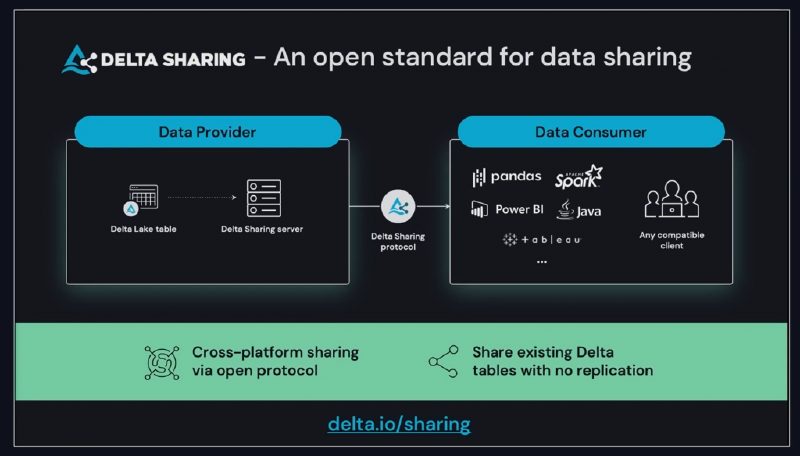 Building upon the Delta file format (also open source) that makes up the backbone of the Data Lakehouse architecture pattern, Delta Sharing exposes the data through a REST API that any platform (that is able to process the underlying parquet files) can interact with.