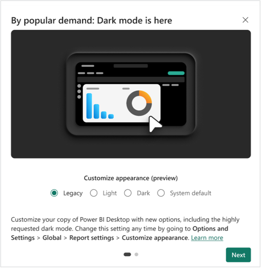 There’s not a lot to say here but this has been a long time coming. It’s not just dark mode though, but the ability to customise the appearance of Power BI Desktop from dark, to light, or mirror your system default. No more seared eyeballs when you’re creating pie charts at 1am.